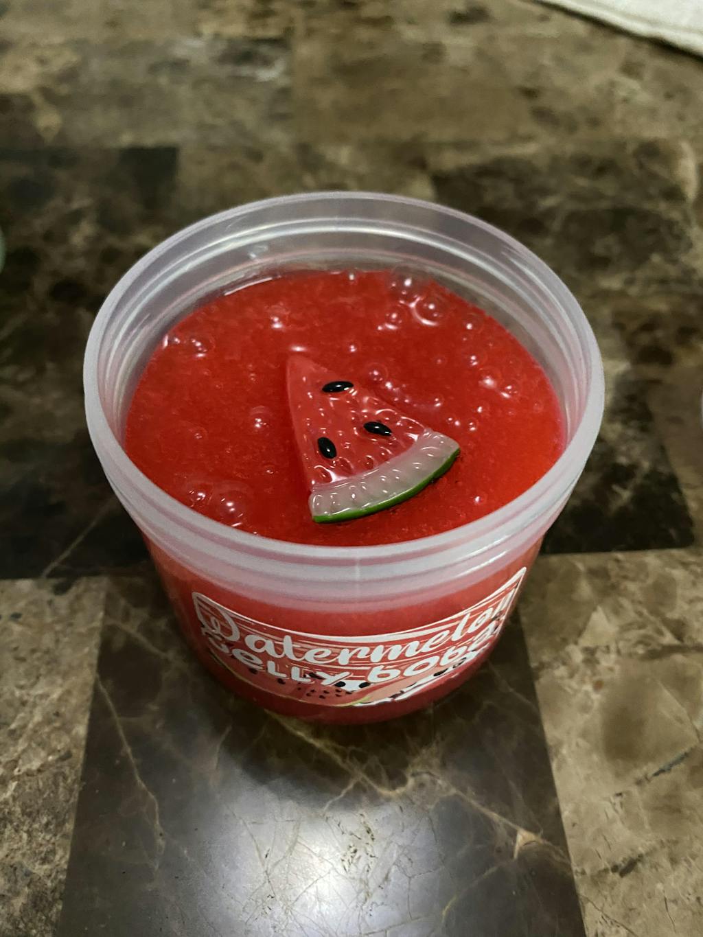 another variation of our "jelly boba" slimes! bright red, clear based thick yet stretchy slime paired with jelly cube sponges and fake boba beads! scented like sour watermelon candy and comes with a boba straw on the side-- the cubes are so fun to squish and add a unique texture too!