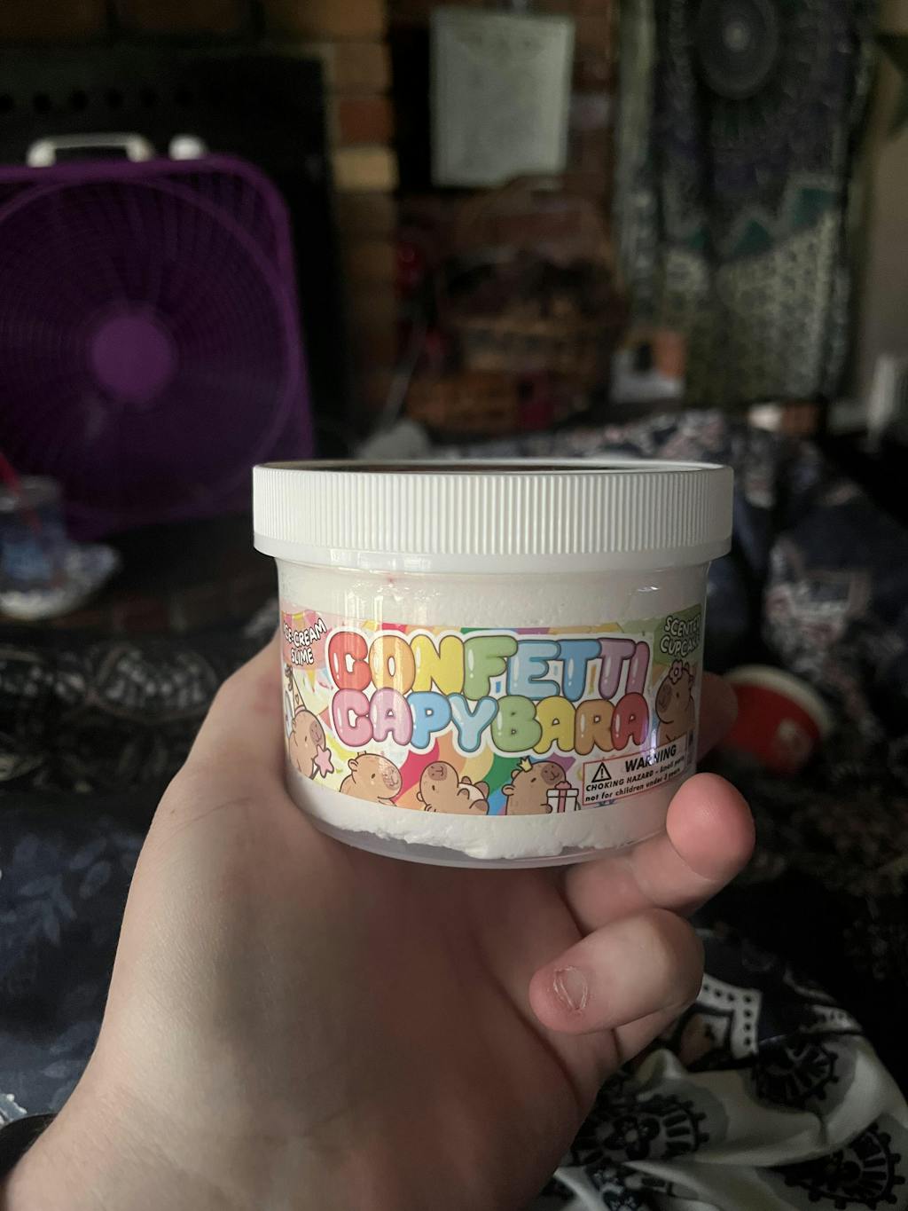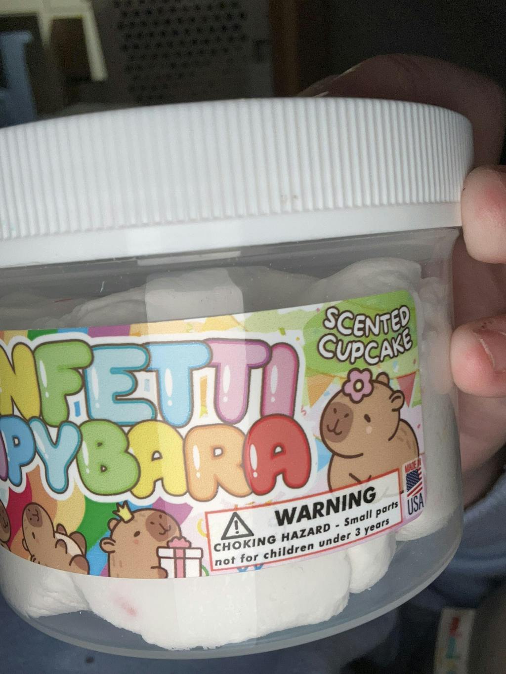 get ready to party with confetti capybara! this fun-tastic soft and dreamy ice cream slime is rolled with birthday cake sprinkles & scented cupcake! includes a cute capybara charm and rainbow confetti shaped fimos!