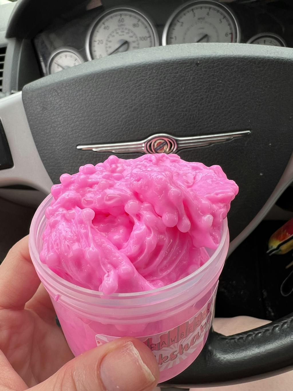 starts with a small layer of white slushee bead slime, then filled with a neon pink slushee bead slime! super crunchy texture for any beaded slime lover! scented just like sweet strawberry milk & has the cutest milk fimos!