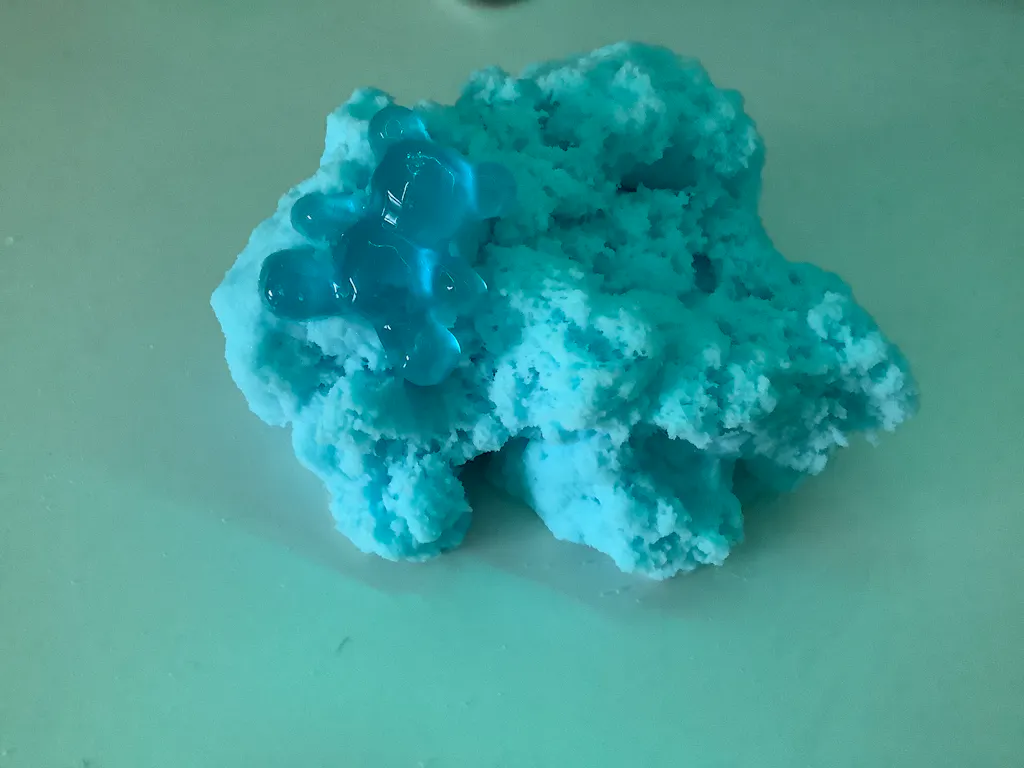 Smells just like blue raspberry and has the perfect cloud texture, ultra dense but fluffs up and drizzles amazingly! topped with dark blue glitter and a blue gummy bear charm!