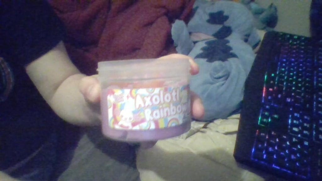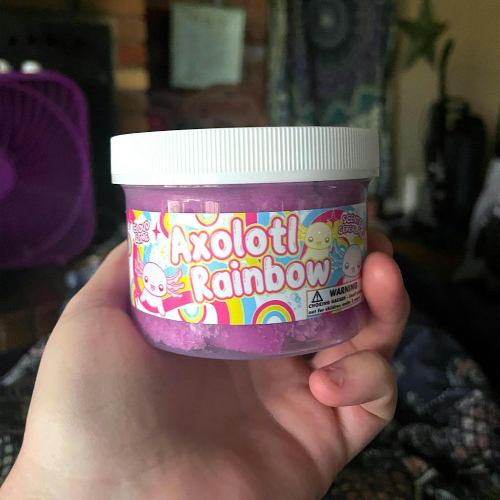 Axolotl Rainbow is a tri-colored soft and drizzly cloud slime that with a vibrant mix of bright teal blue, yellow, and pink colors to mix! It also includes three adorable axolotl charms, rainbow- fimos + scented cereal milk!