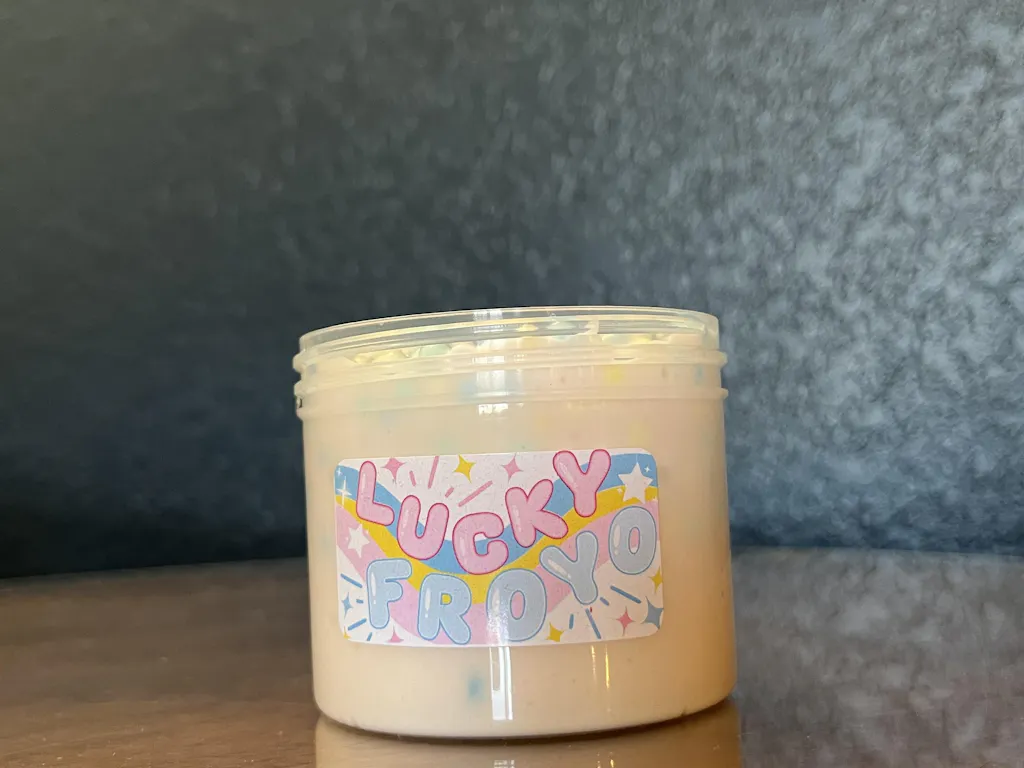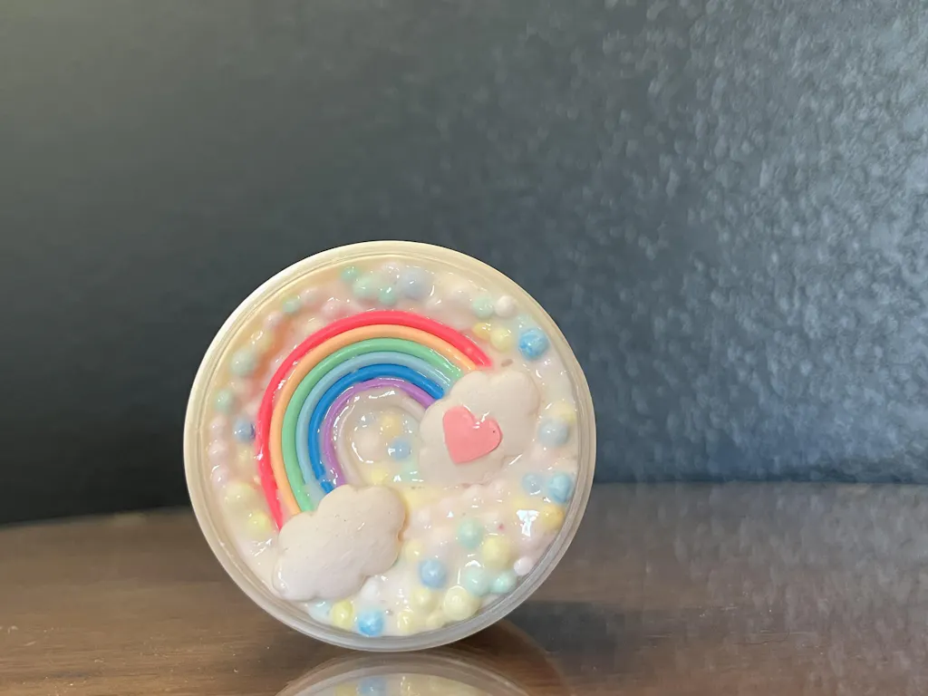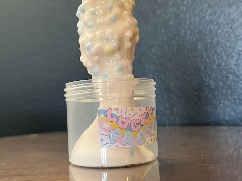 Add a splash of color to your day with Lucky Froyo! Our rainbow pastel foam bead packed thick slime is topped with rainbow fimo and a charm for extra fun. Super crunchy, textured slime any ASMR fan will love! Scented a delicious blend of fruity cereal and sweet strawberry!