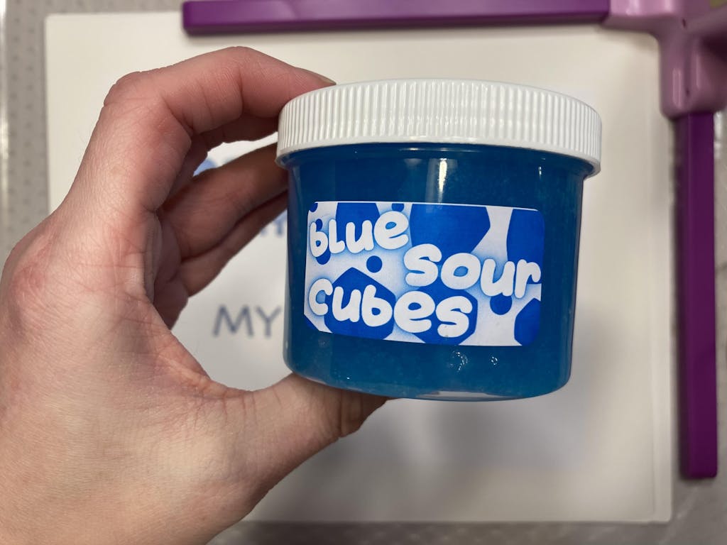 This smells like a blue jolly rancher! I cannot get enough of it!! The texture is jiggly and dense but super stretchy and makes the BEST snaps and pops! I really love the feel (and look) of the foam cubes and they’re really fun to squeeze in the slime. The color reminds me of a melted blue jolly rancher and the cubes make it almost look like a drink. It’s really interesting. This is super fun and Uber satisfying to play with. Our littles to the biggest all enjoy this slime from the look and scent to the texture and feel. Highly recommend for any slime fan of all ages!!