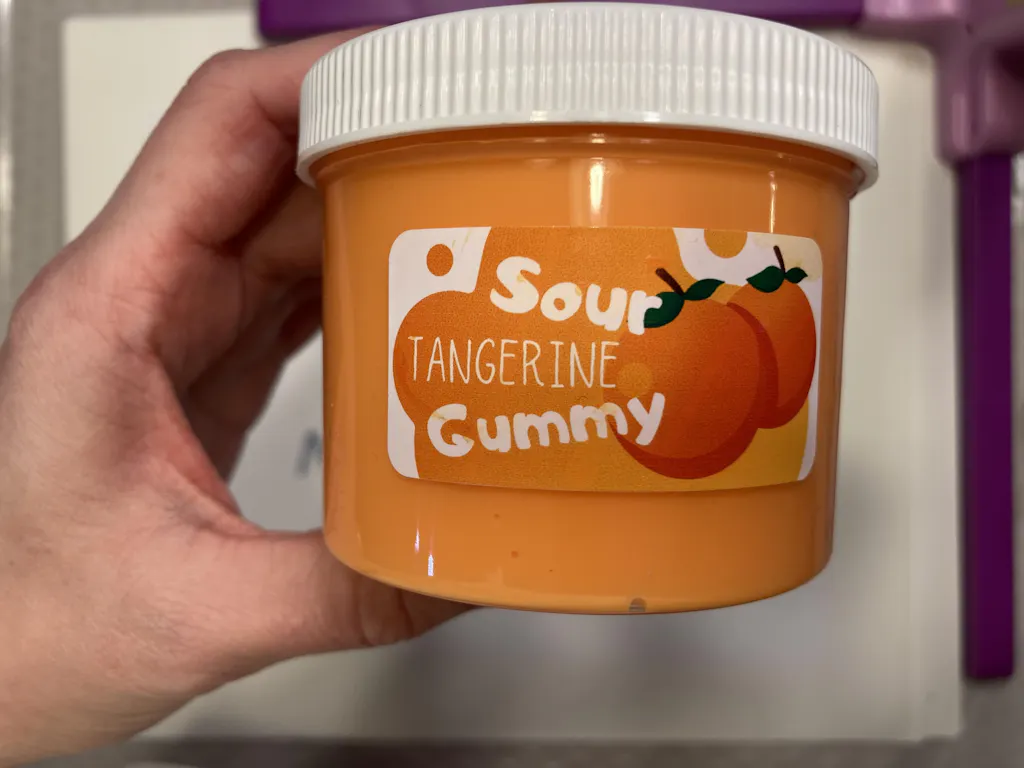 Oh how I love a nice thick, dense, glossy slime that snaps, pops and squishes giving the ultimate satisfaction! This slime is nice a wiggly, jiggly, slime that leaves no residue or mess. There is a little stickiness but nothing that’s too bad, I’d say this is a good moderate slime, not great for the littles or brand new beginners, but with a tiny bit of slime experience, this would be a great fit. The smell is such a happy one and always puts a smile on my face the second I open it. It’s always a great experience to smell while playing! There is a little tangerine charm in this one that is fun to play with but also removes easily if you remove the slime from the back, flat part first. Overall this is a fun slime and is ultra satisfying if you like the slimes that snap and pop while squeezing and squishing!
