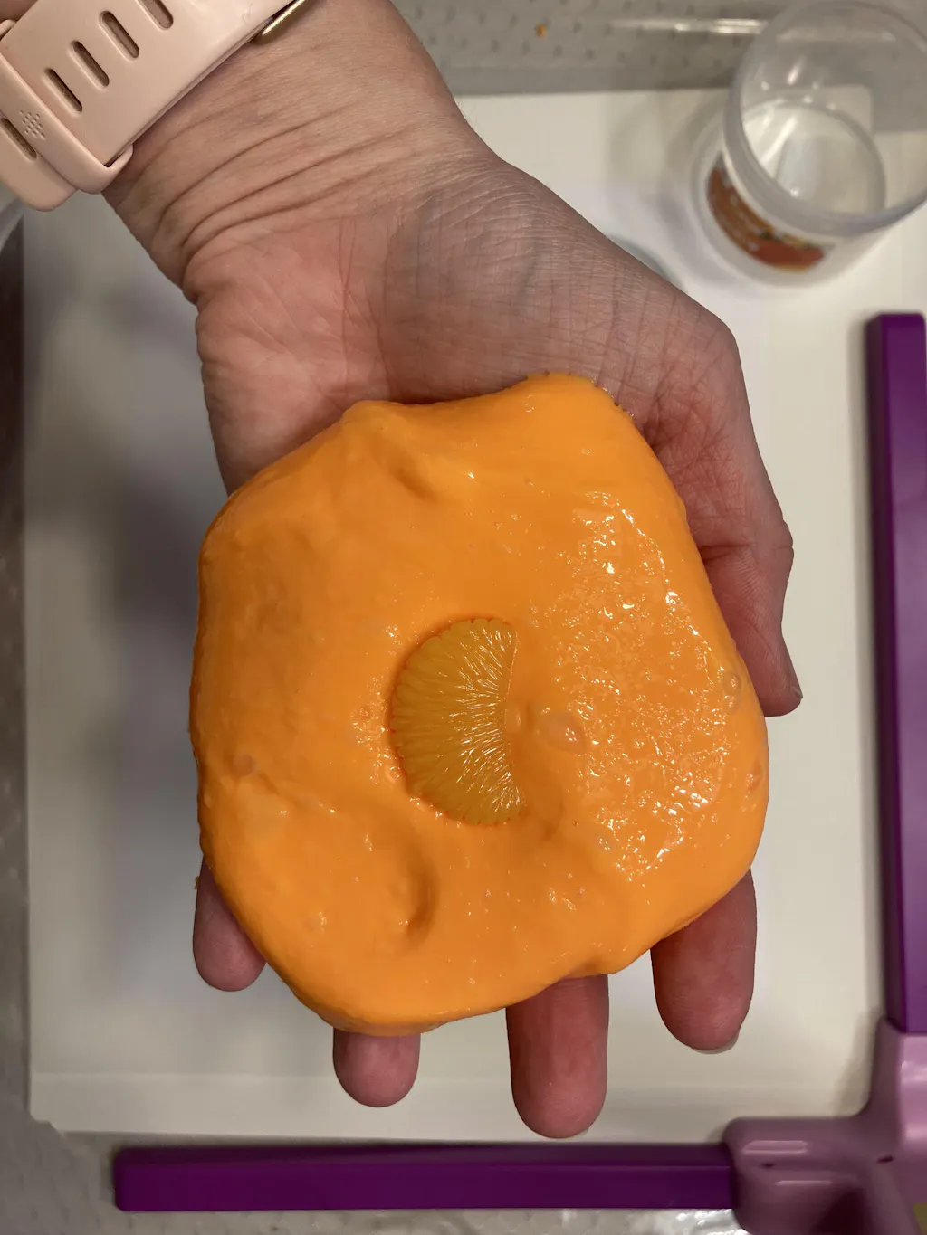 ultra neon orange thick and glossy slime- such a soft yet thick texture that makes amazing bubble pops! soo glossy- scented like a orange cream gummy and comes with the cutest lil tangerine slice charm!